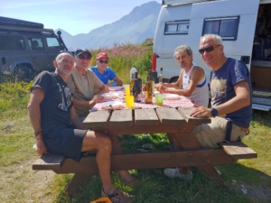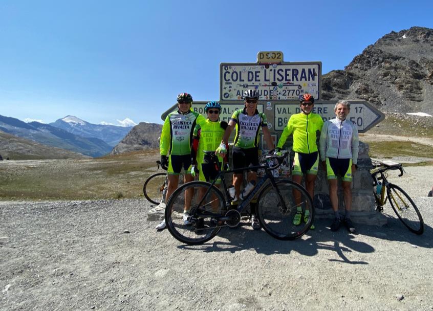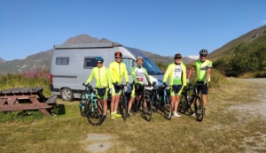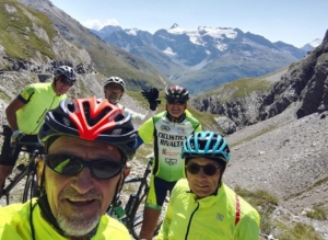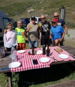 Foto ricordo al valico per testimoniare l’ impresa e si riparte intorno alle h. 13 e gustare la veloce discesa. Durante il trasferimento lungo la valle una coppia di ciclisti si aggrega al ns. trenino e si verifica una caduta non per colpa ns.,