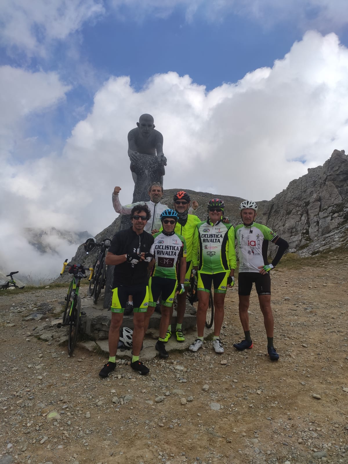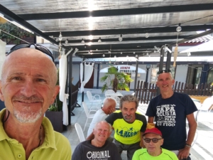 Per fortuna arriviamo tutti sani e salvi alla meta , però un colpo gobbo alla ns.suscettibilità di ciclisti ci viene inferto da una coppia di ciclisti Lui e Lei ns.coetanei che con bici marca 3 galline , abbigliamento vestivamo alla marinara e bagagli al seguito di almeno 30kg arrivano anche loro alla meta per onorare il monumento di Pantani ..sigh! Dai….saranno partiti ieri sera ci consoliamo.