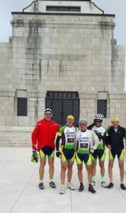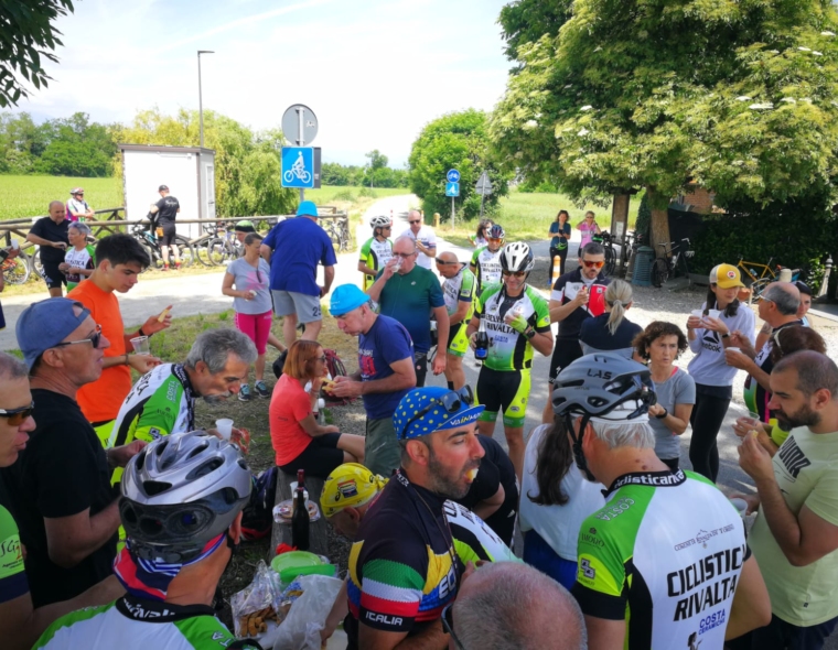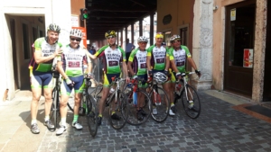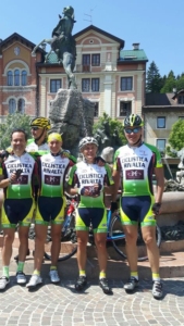 Massi Albertin : di chiare origini venete, si diverte perchè si trova “ si so teren”, punto di riferimento del plotone grande narratore di storie di guerra e aneddoti. Sulla salita al Grappa ha delle visioni e pedala con un invisibile “ cerchio sulla testa” viste le dimensioni del suo elmetto pensiamo che il cerchio fosse veramente grande .