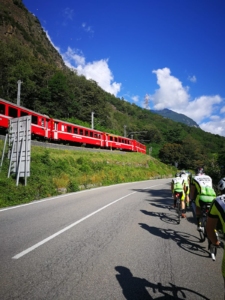 Pronti…via,subito in salita verso il Bernina x raggiungere in circa 25 km il lago di Poschiavo /Svizzera con pendenze comunque sotto il 10 %. La valle si apre subito con il lago e stupendi panorami con il famoso trenino rosso che passa ogni ora e taglia la strada a Dx e Sx.