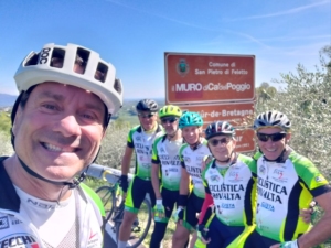 Direi che cominciamo bene ed il giorno dopo tutti in bici si parte per il ” Giro del Prosecco”, come sempre ben pianificato dal nostro Presidente, circa 100 km e 1300 mt di dis.nei vigneti verso Conegliano Veneto; dove ci attende la salita monstre del Muro di Ca’ del Poggio, resa famosa oltre che da noi, anche dai vari passaggi del Giro d’Italia.,